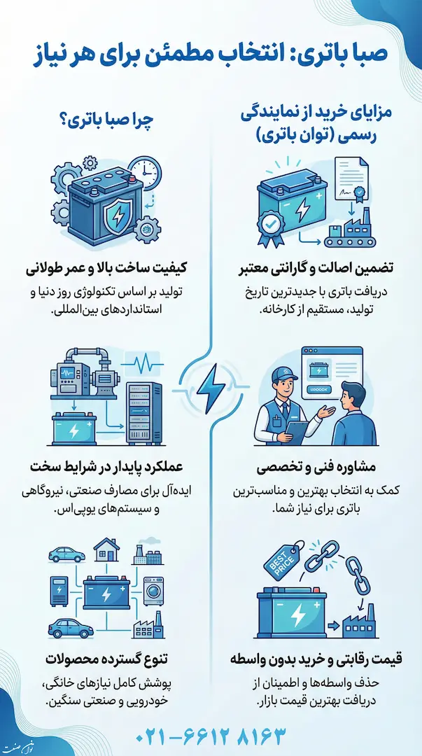این برند با ارائه گستره وسیعی از ولتاژها و ظرفیت‌ ها، توانسته نیازهای متفاوت کاربران را در صنایع مختلف پوشش دهد و گزینه‌ ای مطمئن برای مصرف‌ کنندگان حرفه‌ ای و خانگی باشد. همچنین، مشتریان از پشتیبانی نمایندگی رسمی، خدمات پس از فروش تخصصی و مشاوره فنی بهره‌ مند می‌ شوند که خرید را به تجربه‌ ای مطمئن تبدیل می‌کند. با انتخاب باتری صبا، کاربران نه تنها از عملکرد بهینه و طول عمر طولانی باتری‌ ها بهره‌ مند می‌ شوند، بلکه با اعتماد به یک برند معتبر ایرانی، امنیت و اطمینان در استفاده از تجهیزات خود را تضمین می‌ کنند.