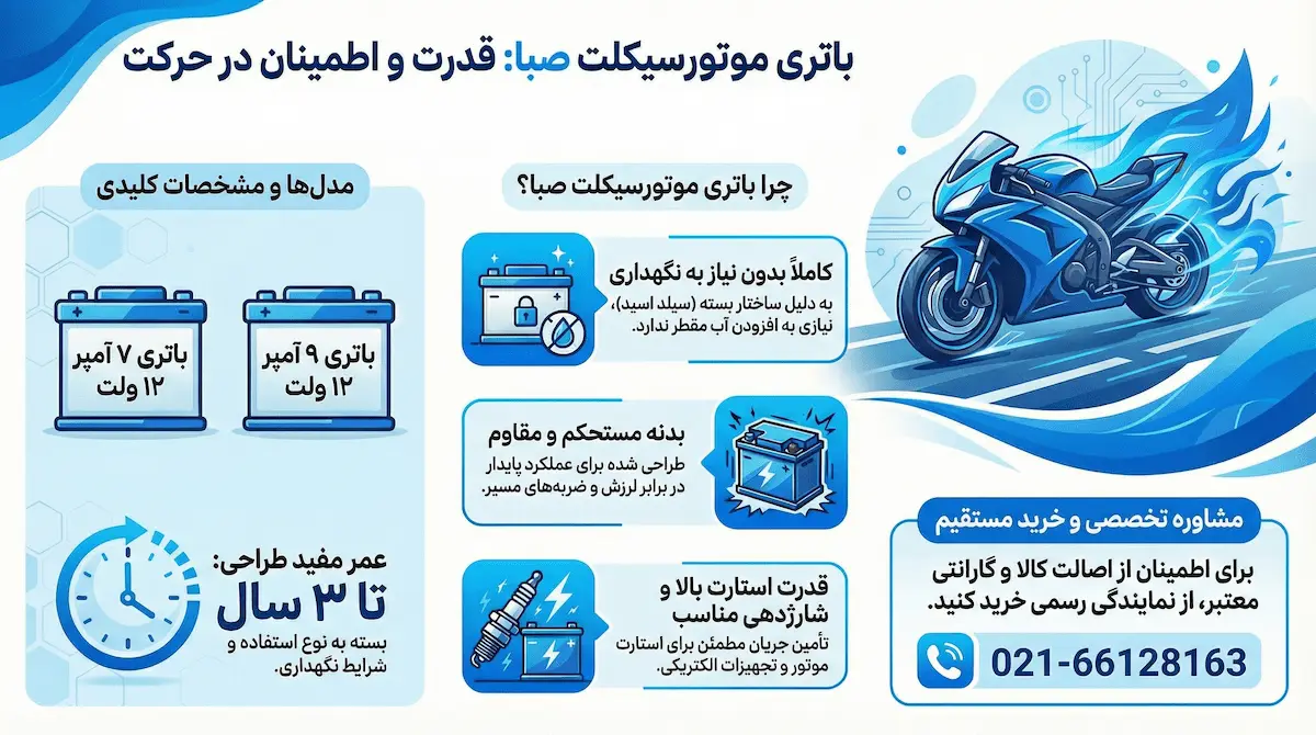 باتری‌های مخصوص موتورسیکلت صبا در ظرفیت‌های ۷ آمپر و ۹ آمپر ساعت با ولتاژ ۱۲ ولت عرضه می‌شوند. طراحی محکم بدنه با استفاده از مواد مقاوم در برابر لرزش و ضربه باعث می‌شود این باتری‌ها در مسیرهای ناهموار و شرایط سخت نیز عملکرد پایداری داشته باشند. از سوی دیگر، قدرت استارت بالا، شارژدهی مناسب و عمر مفید طولانی از ویژگی‌های بارز محصولات صبا باتری در این رده است. برای خرید باطری موتور صبا با ما در تماس باشید.