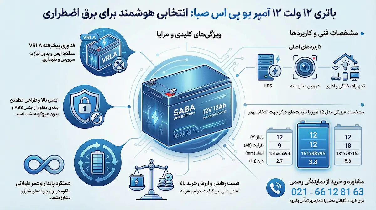 اگر به دنبال خرید باتری UPS با ظرفیت 12 آمپر و گارانتی معتبر هستید، نمایندگی رسمی صبا باتری بهترین مرجع شماست. تمامی محصولات عرضهشده در این مرکز با گارانتی ۱۲ ماهه رسمی، ارسال سریع به سراسر کشور و خدمات پس از فروش کامل ارائه میشوند.